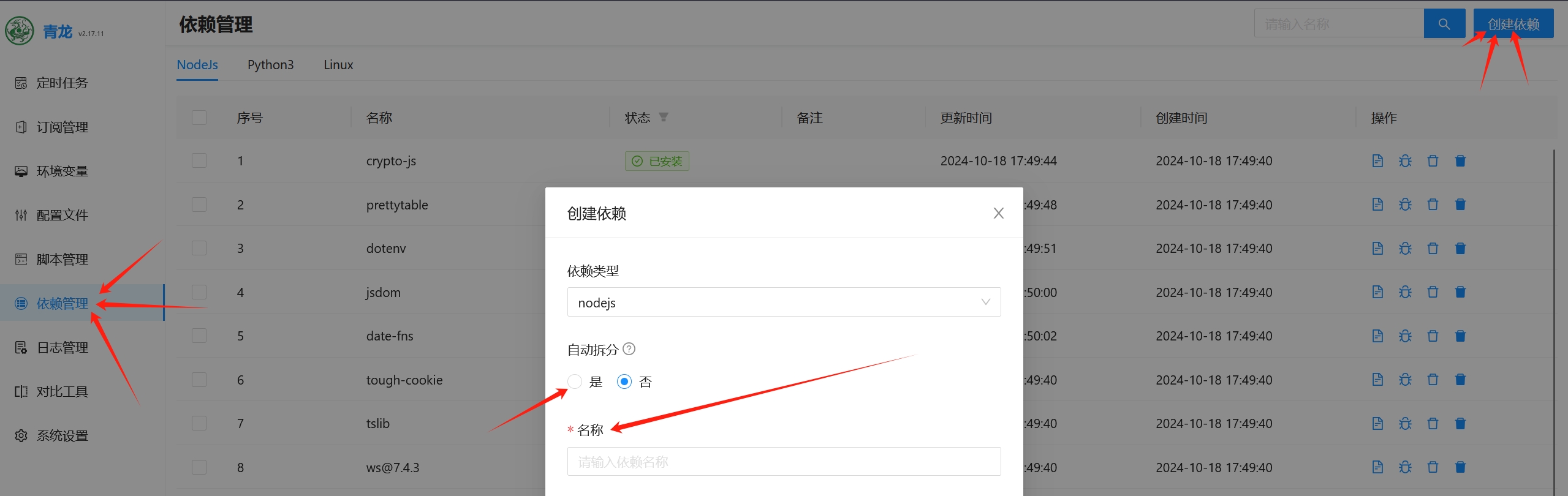 进入面板后,点击【依赖管理】,类型分三种【NodeJs】、【Python3】、【Linux】,我们分别添加进去,我把依赖库贴下面